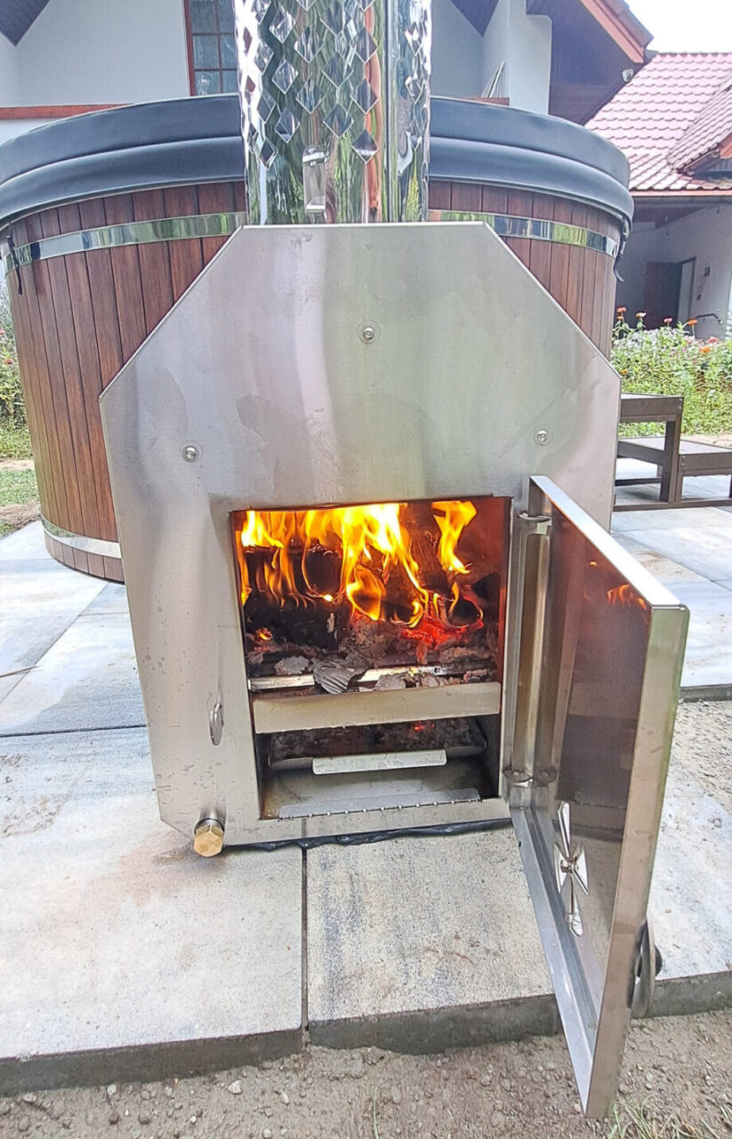 Wykonany z wysokiej jakości stali nierdzewnej AISI 304, zewnętrzny piec z płaszczem wodnym o grubość stali 2mm lub 3mm sprawia, iż nagrzanie bani o średnicy 200 cm (około 1300 litrów wody) zajmuje około 2 godzin. Komplet obejmuje: piec, komin dwuczęściowy wraz z czapą, przewody gumowe do podłączenia do balii, dwa przejścia burtowe.